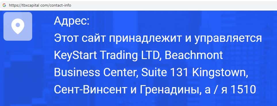 Аферисты TBXCapital указали адрес места регистрации своей компании, который вероятнее всего вымышленный: