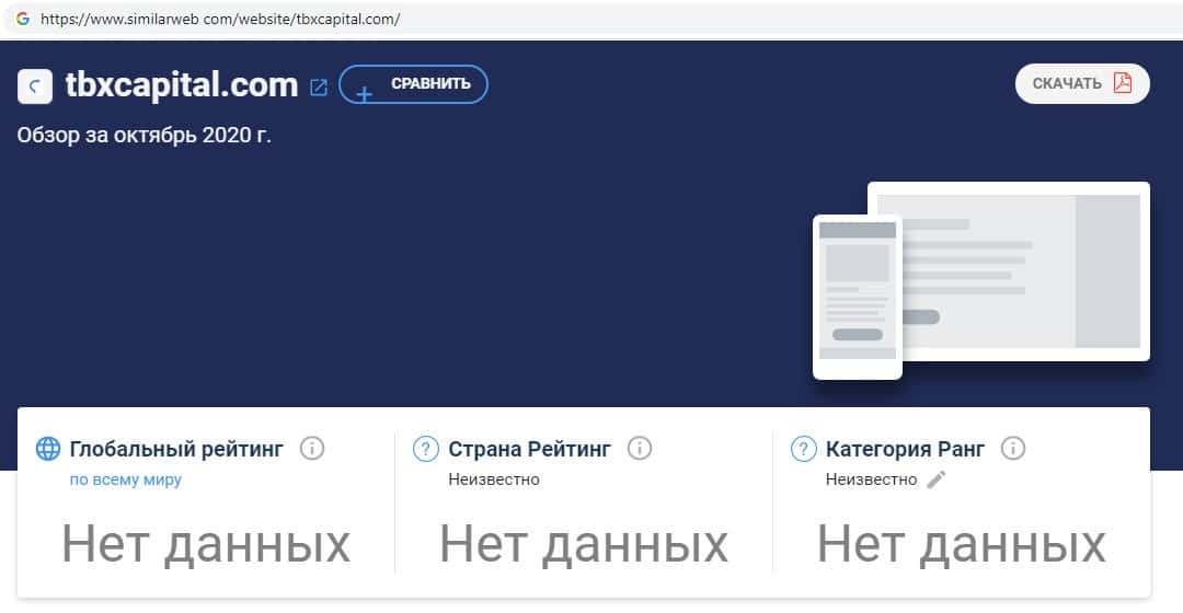 При проверке источников бренда по странам скам-конторы TBX Capital на сайте similarweb com, информация отсутствует, что является признаком фейкового лохотрона.