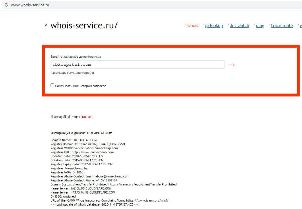 - Данные о владельце домена конторы TBX Capital отсутствуют