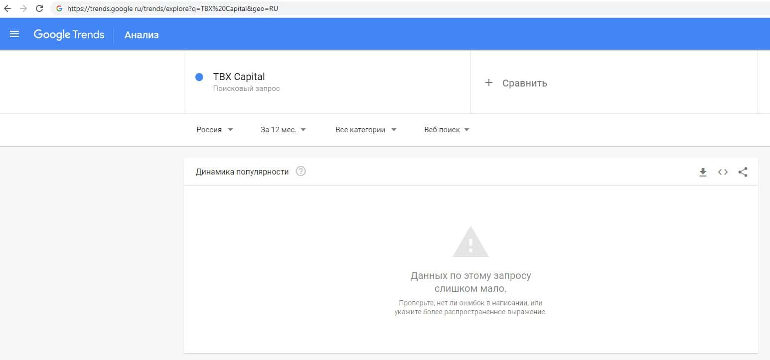 О количестве брендовых запросов название домена компании "tbxcapital.com" на Гугл Трендс нет никакой информации.