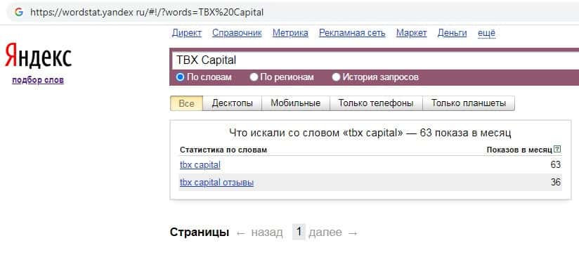 Количество запросов по бренду название домена компании "tbxcapital.com" на wordstat yandex ru составляет 177 показов за месяц.