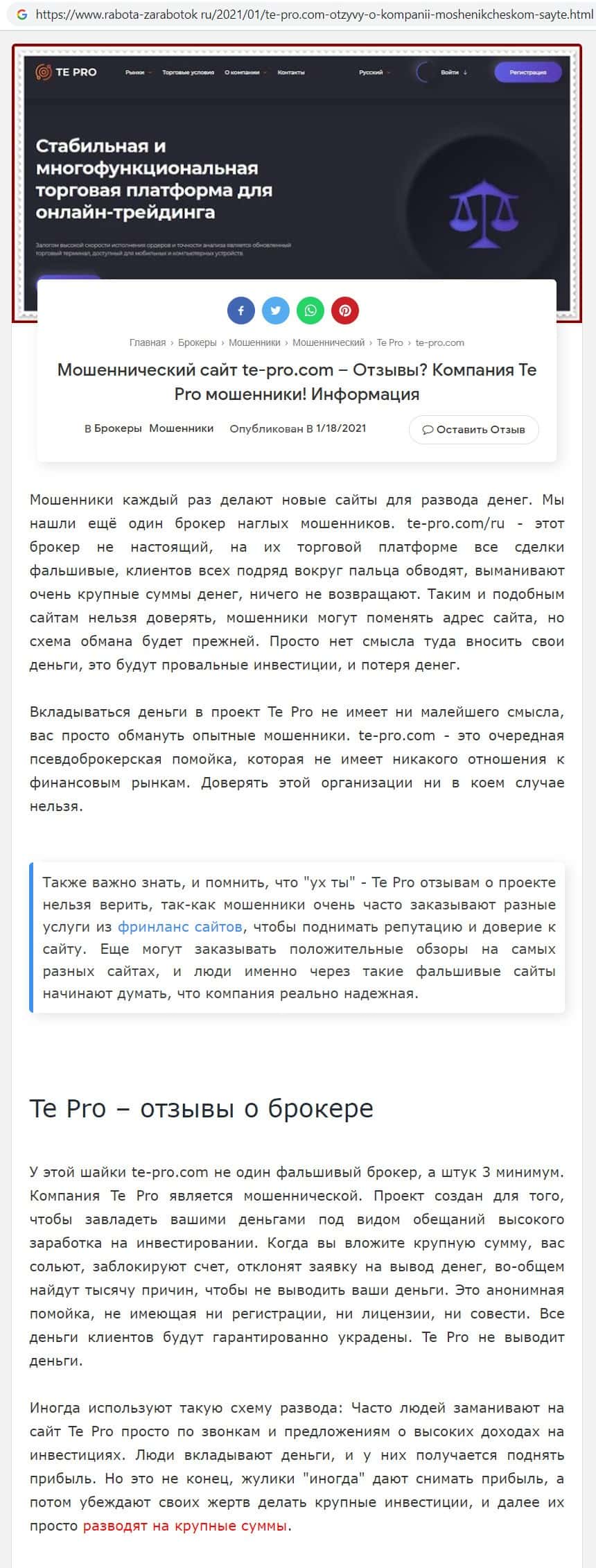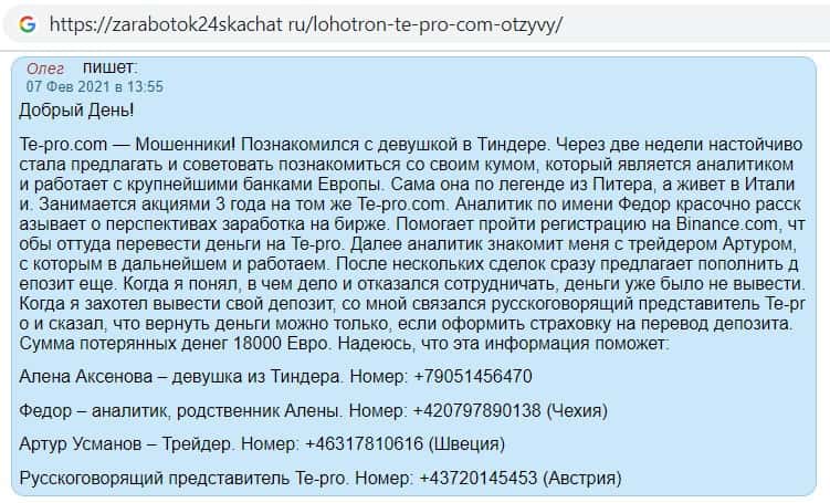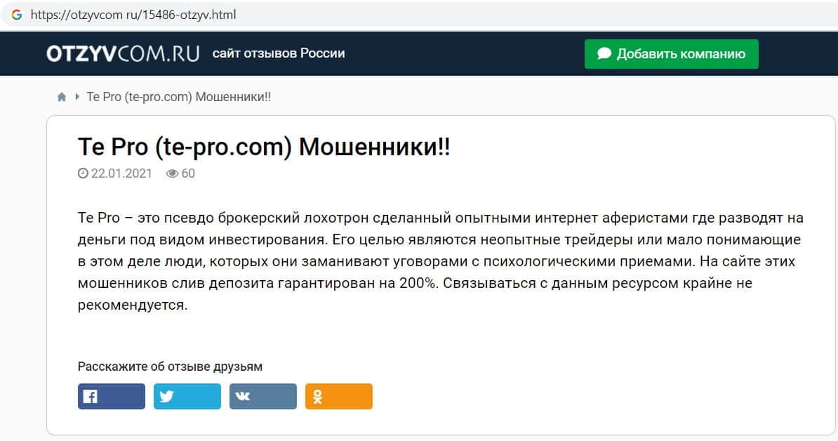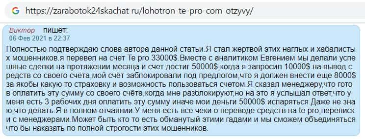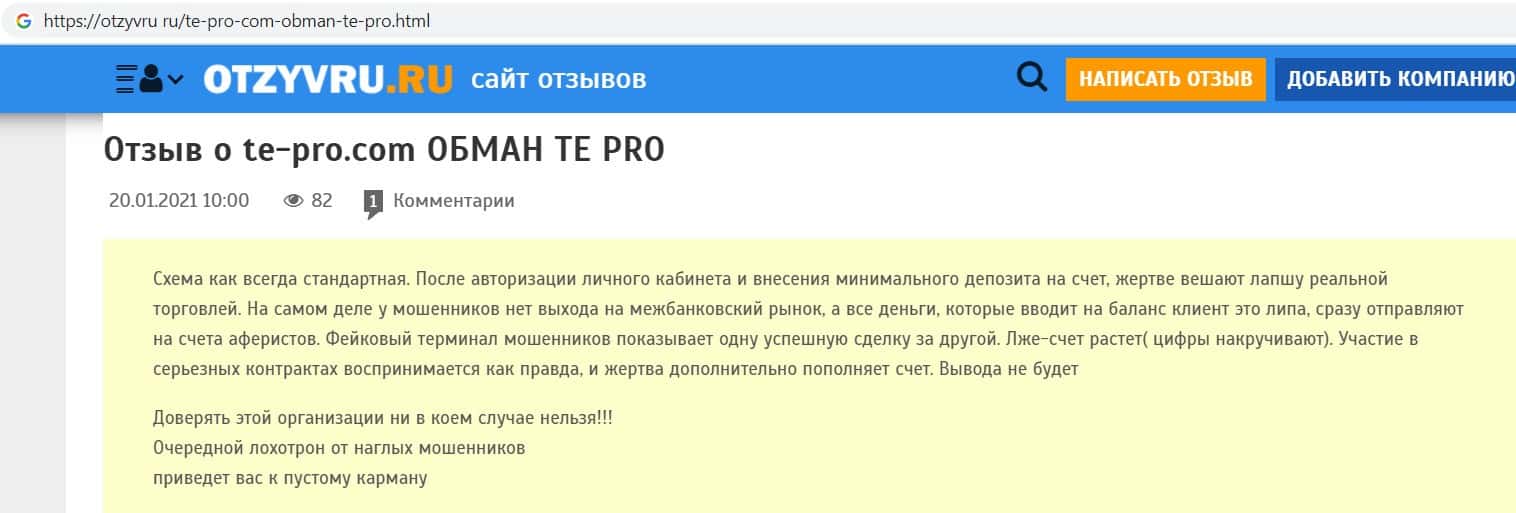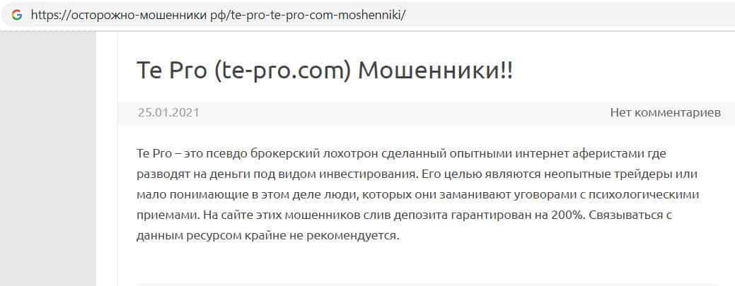 Так же сайт otzyvcom ru не остался в стороне и рассказал, что фирма Te Pro является финансовым лохотроном, который наглым образом обманывает клиентов отбирает их деньги.