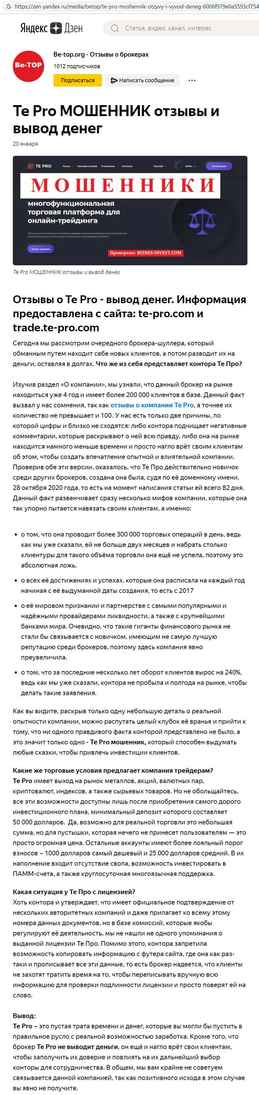 Так же сайт zen yandex ru рассказал, что фирма жуликов Те Про не только не выводит средства клиентов, но и врёт всем пользователям, что бы выманить деньги клиента.