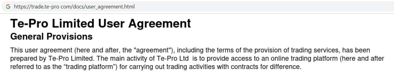 На своём главном интернет ресурсе фирма финансовых махинаторов предоставила информацию о своём юридическом лице, которым является компания Te-Pro Ltd.