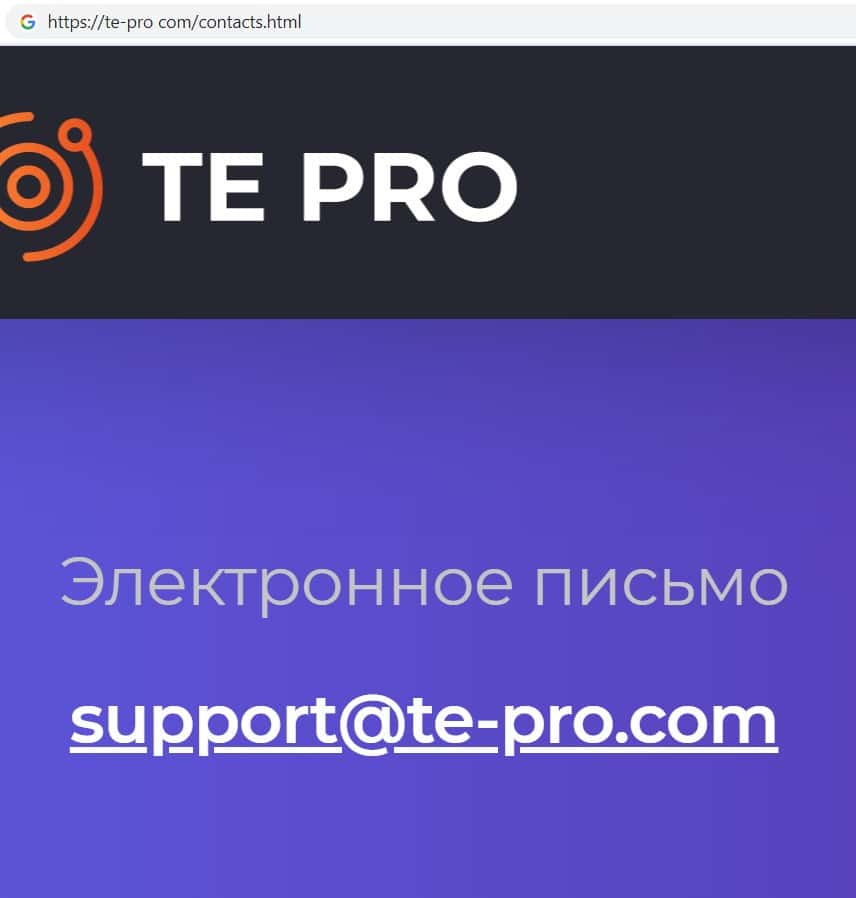 Так же фирма разводил Te Pro указала контактный адрес электронной почты, с которого фирма так же выманивает средства своих клиентов. Электронная почта мошенников: