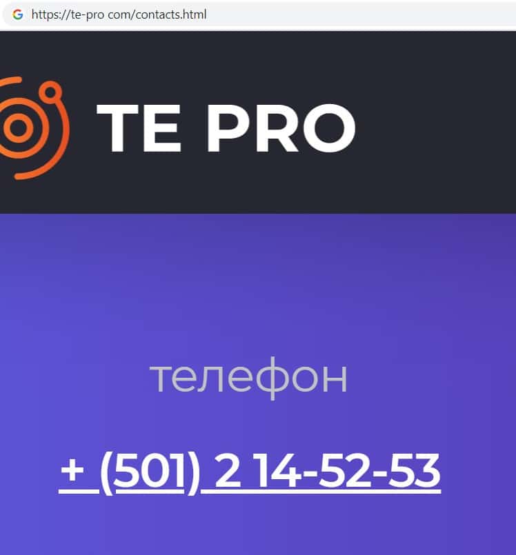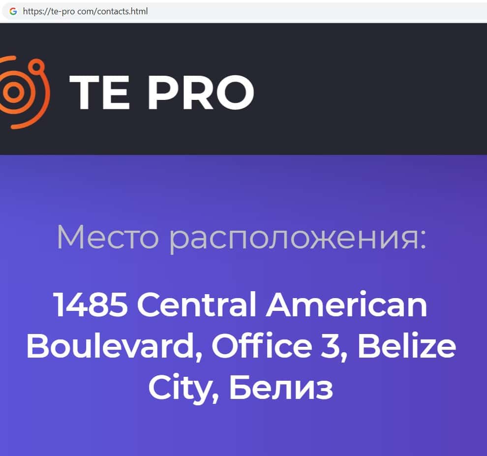 Ещё мошенническая контора Te Pro указала адрес своего главного офиса, но эта информация является фальшивкой, так как никакого офиса у данного лохотрона нет. Адрес: