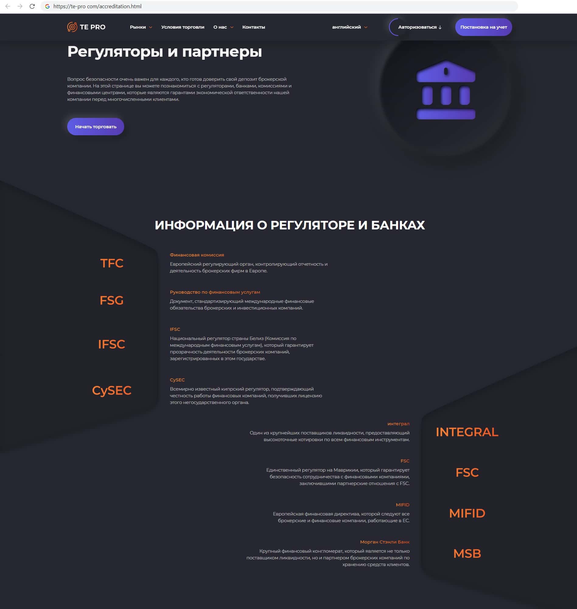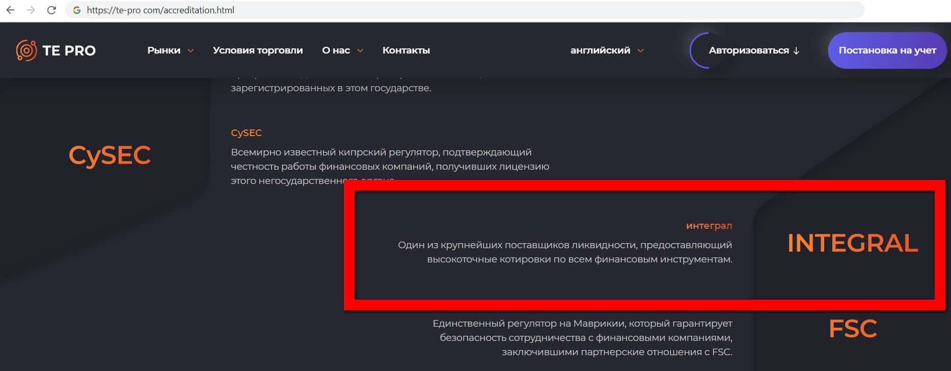 Фирма финансовых аферистов Те Про указала на своём сайте информацию о регуляторах и партнёрах, которыми являются такие мошенники как: CySEC, FSC, IFSC.