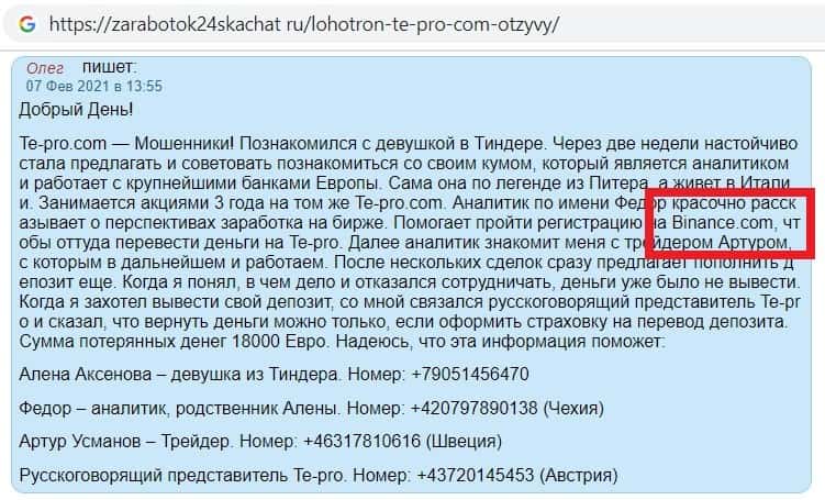 В одном из отзывов пользователь написал, что с ним связался мошенник, который предложил заработать, и для этого нужно зарегистрироваться в Te Pro а так же в Binance.