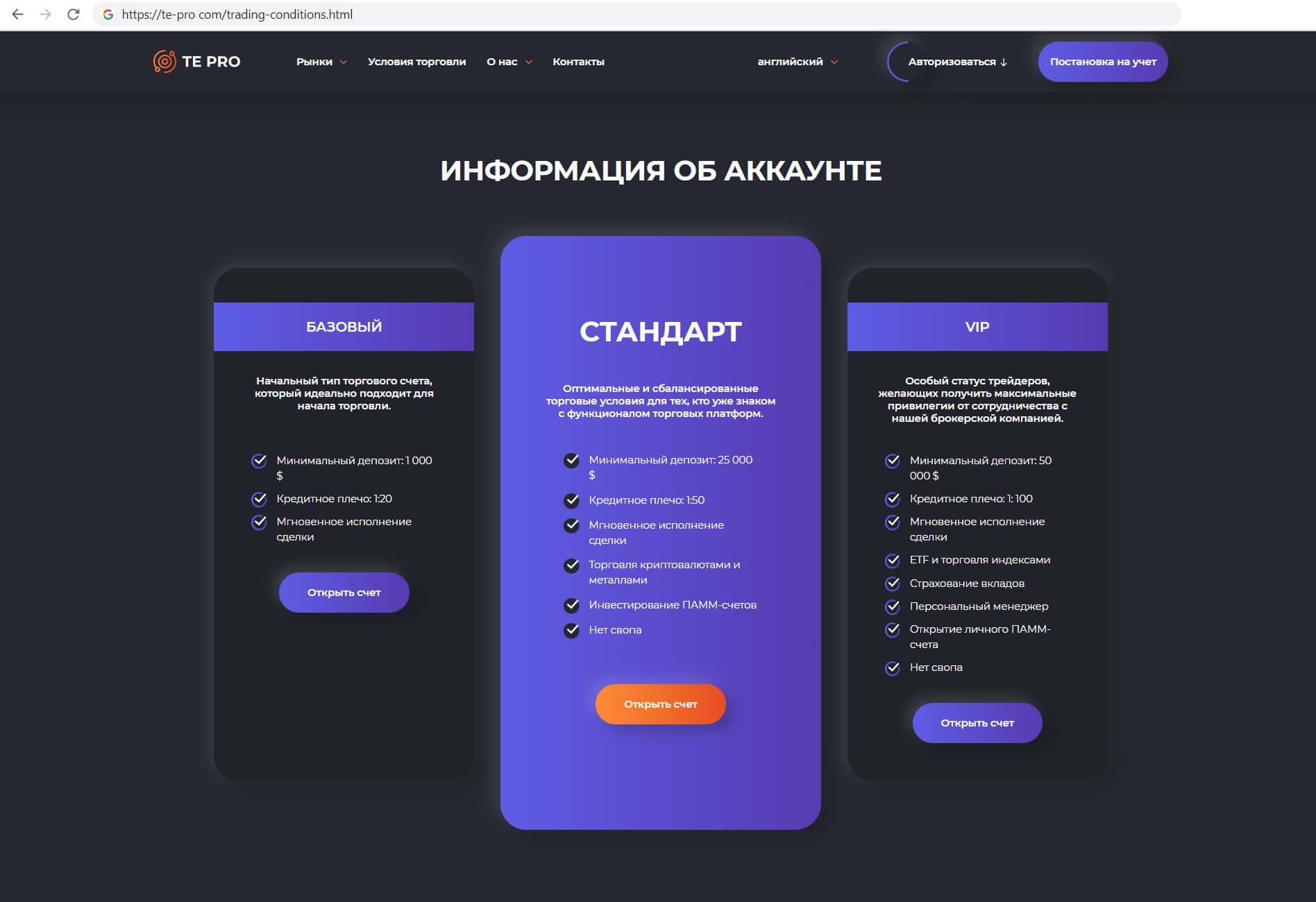 Финансовые разводилы Те Про представили клиентам на выбор три типа счетов, которые отличаются минимальным депозитом, который варьируется от 1000 до 50000 долларов.