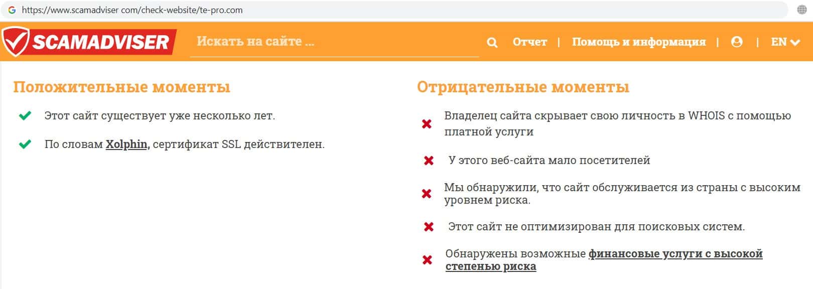 Мнение интернет ресурса scamadviser com о сайте разводил Te Pro