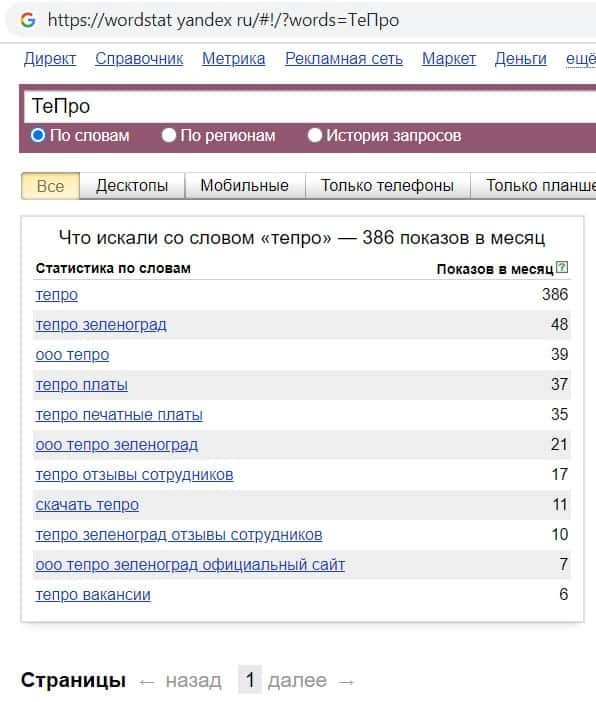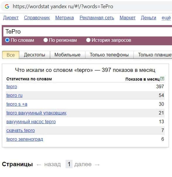Далее мы проверили количество запросов фирмы Te Pro по названию конторы, но без пробела, а именно "TePro". 397 раз пользователи выполнили данный запрос.