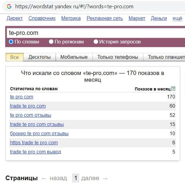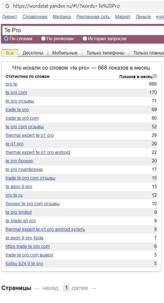 Мы проверили количество запросов компании кидал Te Pro в Яндексе по названию фирмы, а именно "Te Pro". Данный запрос пользователи выполнили 668 раз в течении месяца.