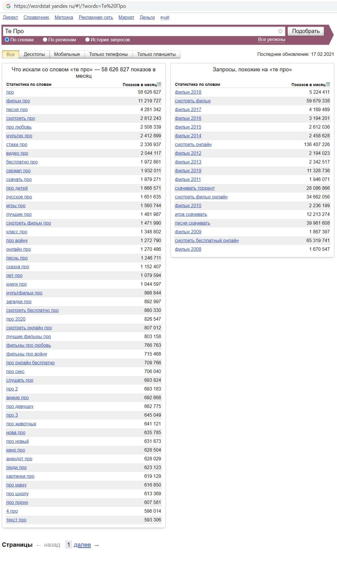Ещё мы проверили количество запросов фирмы жуликов Te Pro по русскоязычному названию конторы, а именно "Те Про". Этот запрос пользователи выполнили 58626827 раз.