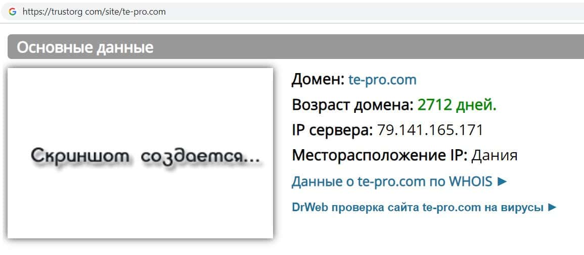 С помощью сайта "Доверие в Сети" мы узнал, что сайту кидал Те Про более 7 лет. Но аферисты просто купили свой домен, что бы врать клиента м своём опыте работы.