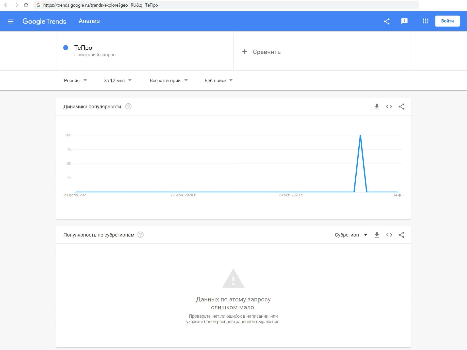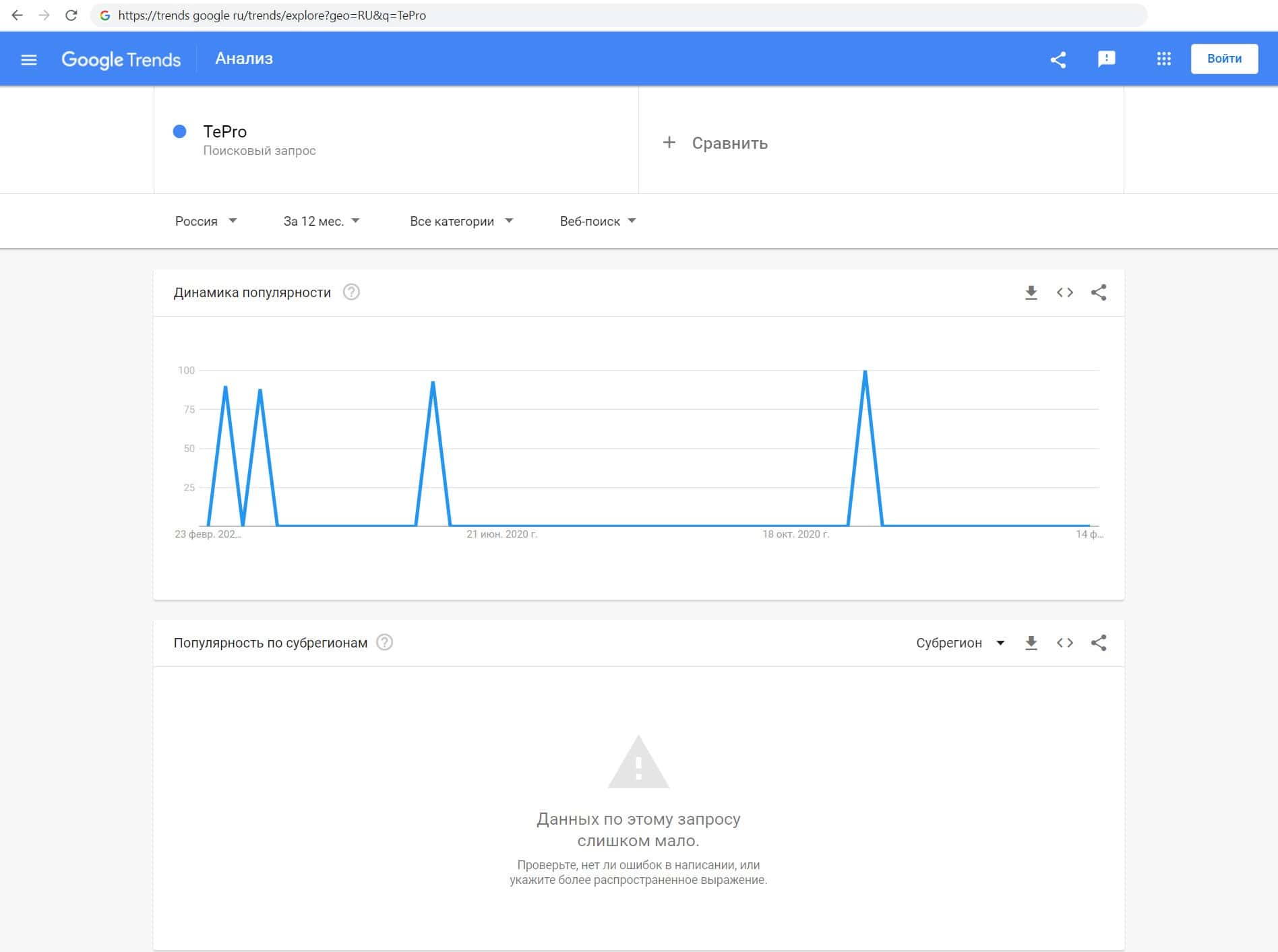 Проверили мы количество запросов псевдоброкера Те Про по русскоязычному названию без пробела, а именно "ТеПро". Этот запрос пользователи выполнили не более 100 раз.