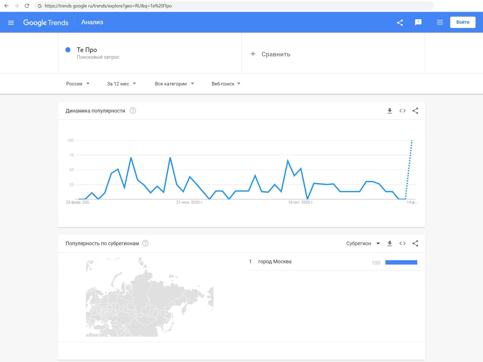 Ещё мы решили проверить количество запросов фирмы Te Pro по русскоязычному названию, а именно "Те Про". Данный запрос выполняли только пользователи из Москвы.