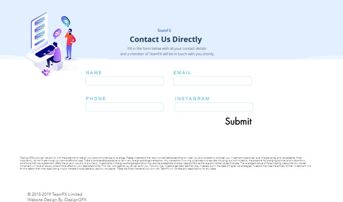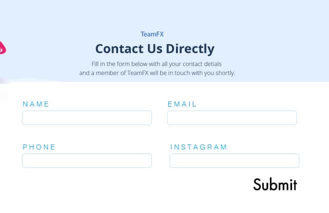 Ввиду подвальности мошенников TeamFXTrading они не предоставляют никаких контактов, или же средств связи с ними. Вместо этого шулера Теам ФХ Трейдинг попросту оставили на своем сайте довольно сомнительную форму связи, в которой клиент должен указать свои данные. Данную форму вы можете увидеть на изображении ниже.