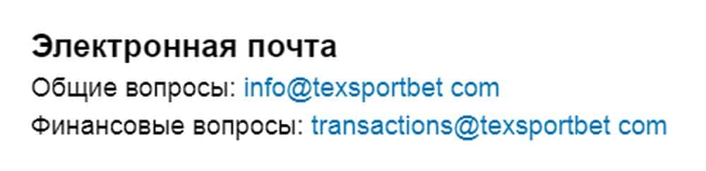 Кроме того, на сайте махинаторы Текс Спорт Бет предоставили два электронных адреса: один для переводов, другой для общих вопросов. Но и они реагируют, только когда это выгодно: