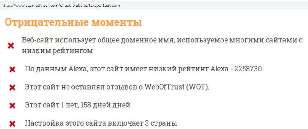 Аферисты Текс Спорт Бет стараются не светиться в сети, но некоторые спецресурсы все-таки заметили шарагу, занесли в черный список и советуют игрокам обходить ее стороной.