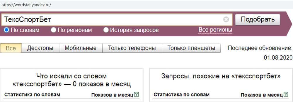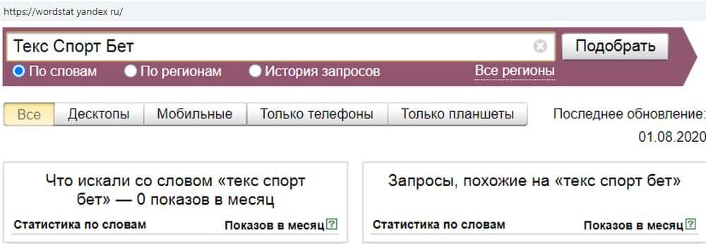 При слитном написании получаем о же результат. По запросу "ТексСпортБет" показов не было. Это тревожный знак, который говорит о том, что контора может скоро схлопнуться.