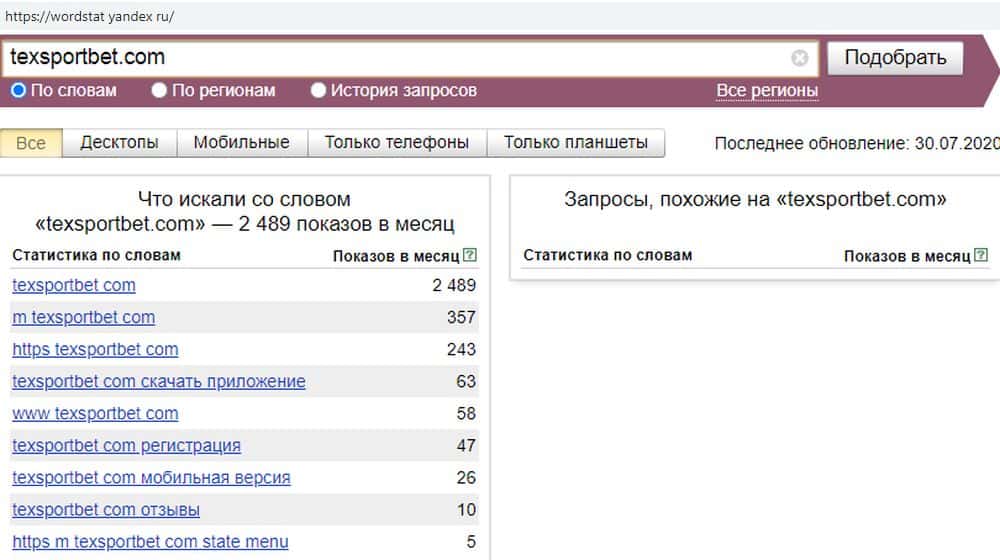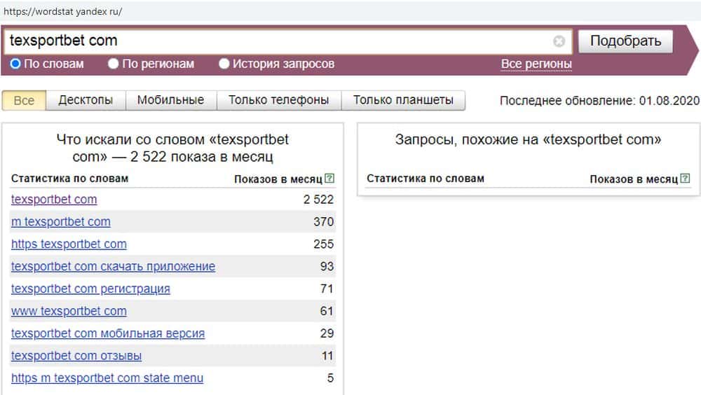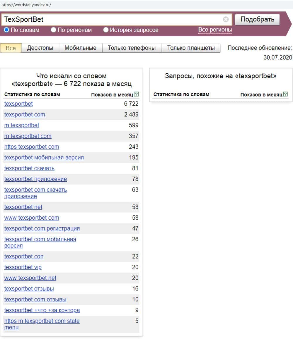 По запросу "TexSportBet" было 6722 показа, и еще несколько тысяч по смежным запросам. Люди в основном пытаются найти несуществующие отзывы о мухлевщиках TexSportBet в сети.