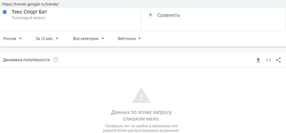 Сервис Гугл Трендз показывает, что недобукмекер Текс Спорт Бет пользователей поисковой системы Гугл почти не интересует. По запросу "Текс Спорт Бет" за целый год показов не было.
