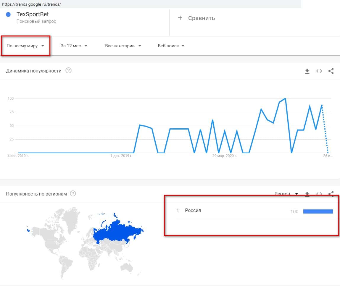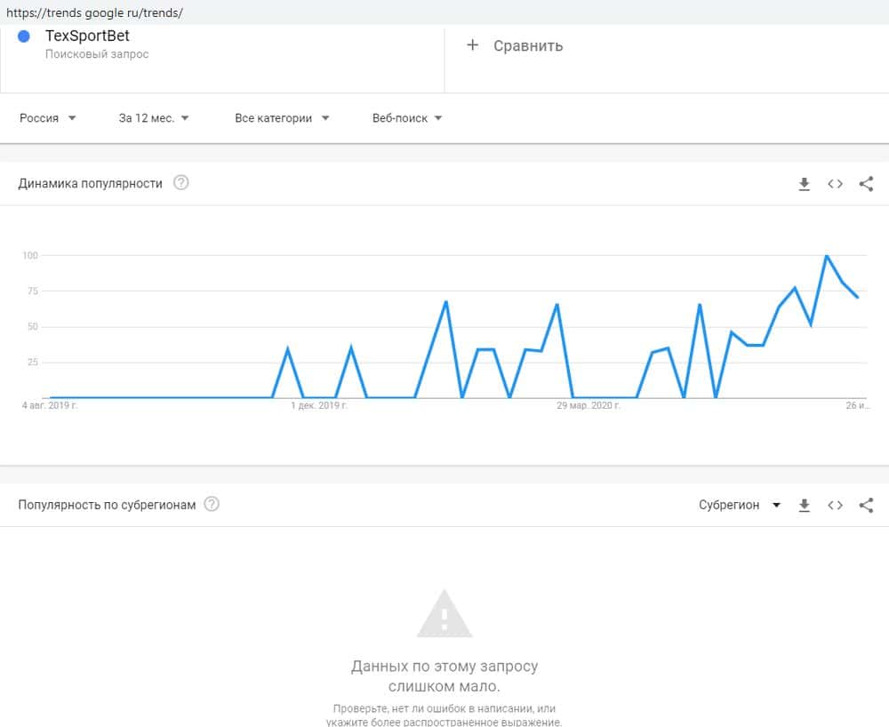А вот в латинской транслитерации запрос "TexSportBet" людей интересует. Сервис Гугл Трендз показывает, что пик посещаемости приходится на конец прошлого и начало этого года.