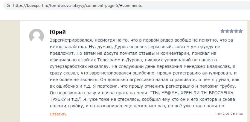 В данном отзыве мы видим, как пользователь рассказал, что компания мошенников Телеграм 10 уделила ему 15 минут, для агрессивного развода на деньги. За то время, что представители компании рассказывали ему о их проекте, пользователь почитал информацию в интернете, и понял, что это очередной лохотрон.