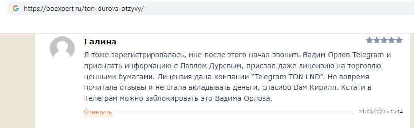 Данный отзыв написала некая Галина. Она написала, что зарегистрировалась в фирме жуликов Telegram10 Ru, и сразу после этого ей начал звонить якобы представитель компании по имени Вадим Орлов. Он уговаривал её инвестировать деньги, так же демонстрировал фальшивые документы. Но пользователь вовремя прочёл разоблачительную статью.