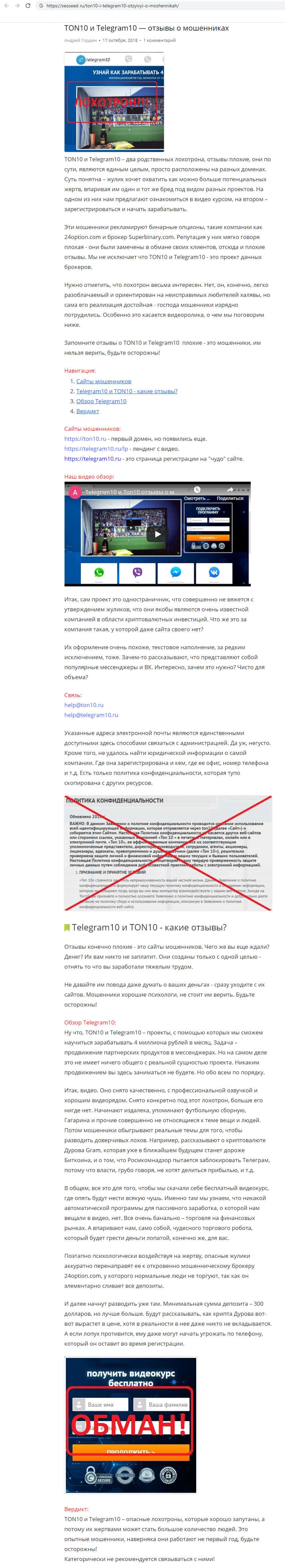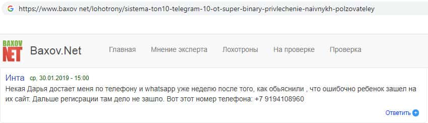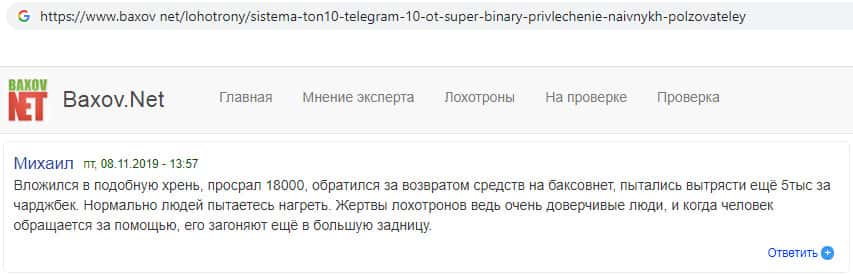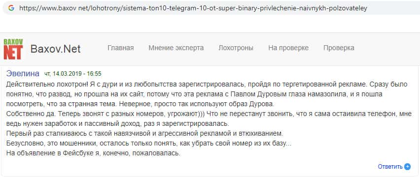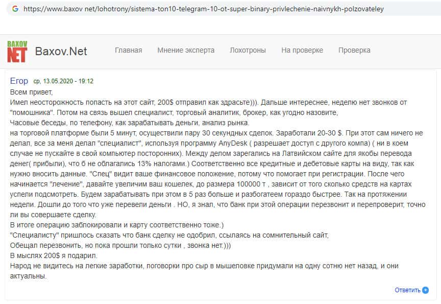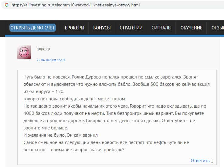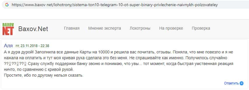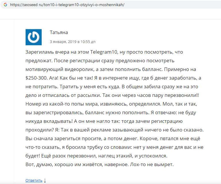 Отзыв пользователя к разоблачительной статье о кидалах Telegram10 Ru