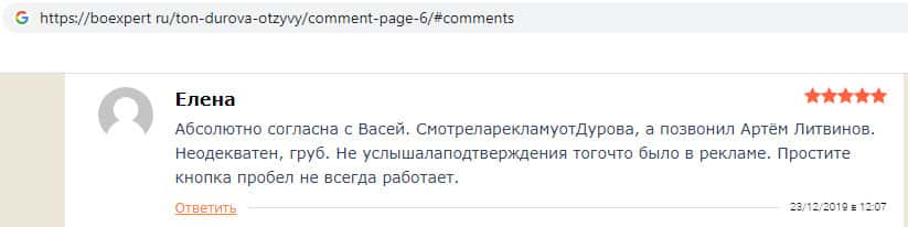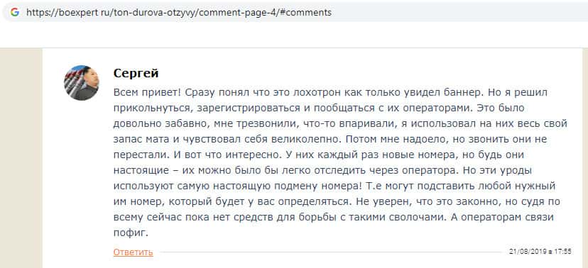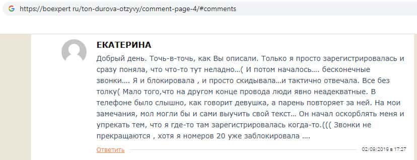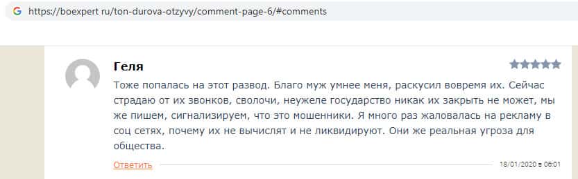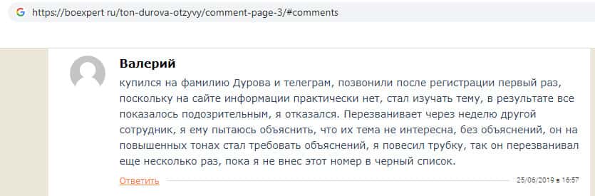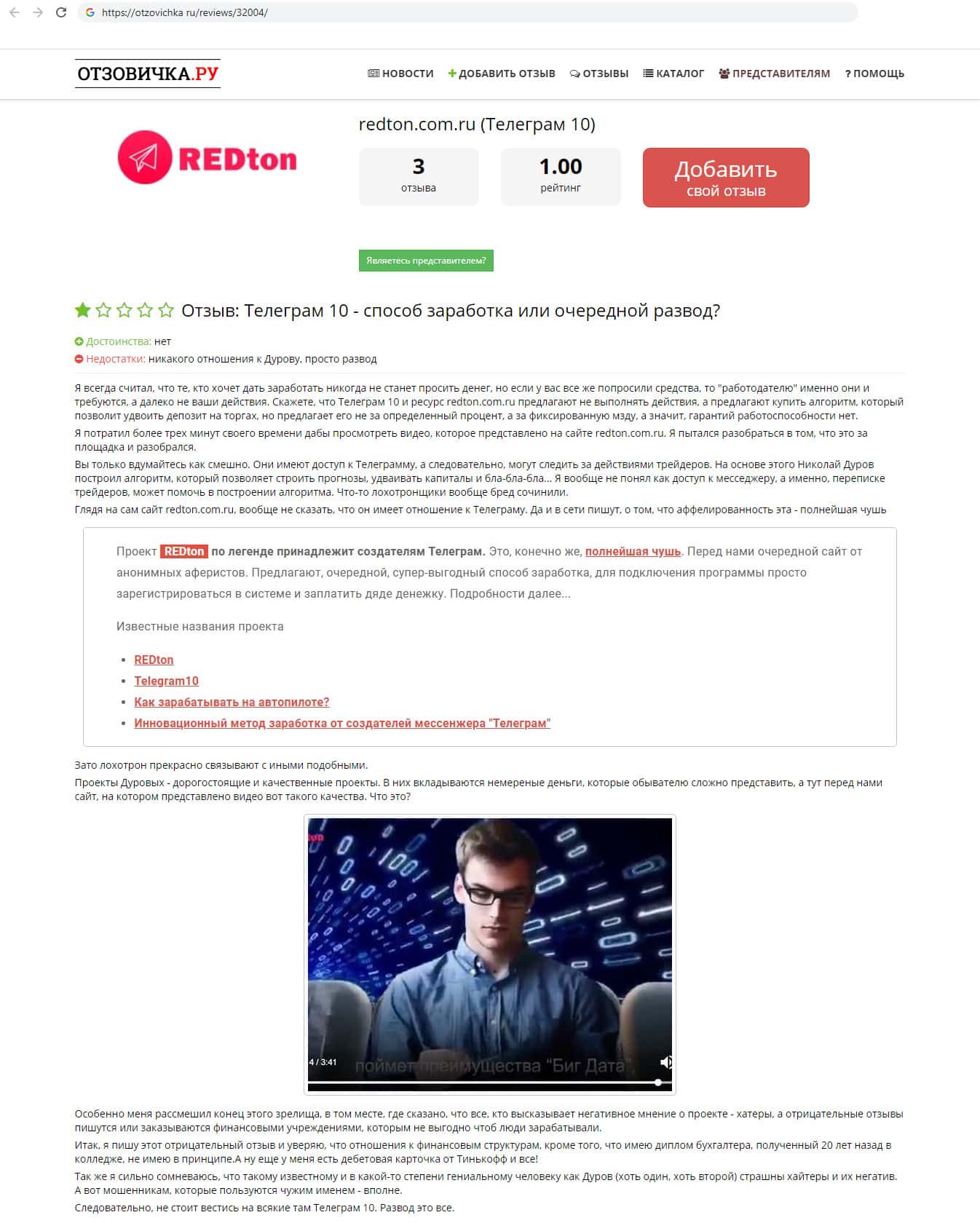 Сайт otzovichka ru опубликовал статью о связи мошеннической компании Телеграм 10 с аферистами REDton. Интернет ресурс привёл доказательства того, что это одни и те же мошенники, которые пользуются именем Дурова для своих проектов. Так же сайт утверждает, что проекты Дурова дорогостоящие вложения, а это анонимные лохотроны.