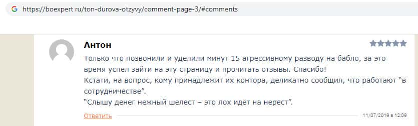 В данном отзыве о компании финансовых мошенниках Телеграм 10 мы видим как пользователь сообщил, что компания очень давит по телефону. Пользователя уговаривали срочно внести хотя бы половину депозита, так как им это нужно, но пользователь не повёлся и послал их подальше, так как не захотел связываться с лохотроном.