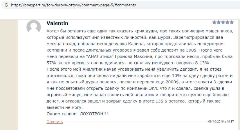 Пользователь в своём отзыве о конторе кидал Телеграм 10 назвал компанию лохотроном. Так же он задался вопросом, где настоящая разработка Павла Дурова, так как у него нет ничего общего с обозреваемыми мошенниками. Компания просто прикрывается его именем, что бы завлечь пользователей, так как они не подозревают об обмане.