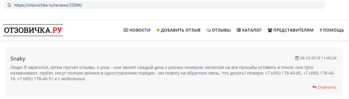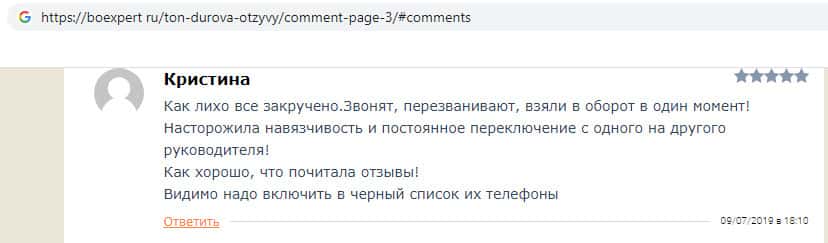 В своём отзыве о недоконторе Telegram10 Ru пользователь сообщил, что изначально повёлся на имя знаменитого человека и на название крупной компании, и зарегистрировался. Но изучив подробнее информацию о фирме, понял что это лохотрон. Но ему начали названивать менеджеры и требовать объяснений, после чего клиент компании внёс номер в чёрный список.