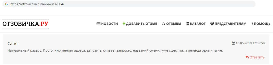 В данном отзыве пользователь сообщает, что компания мошенников Telegram10 Ru - это натуральный развод. Фирма запросто сливает депозиты клиентов, меняет адреса, а так же пользователь заметил, что мошенники сменили название более 10 раз, так как сталкивался с такой же компанией, но с другим названием.