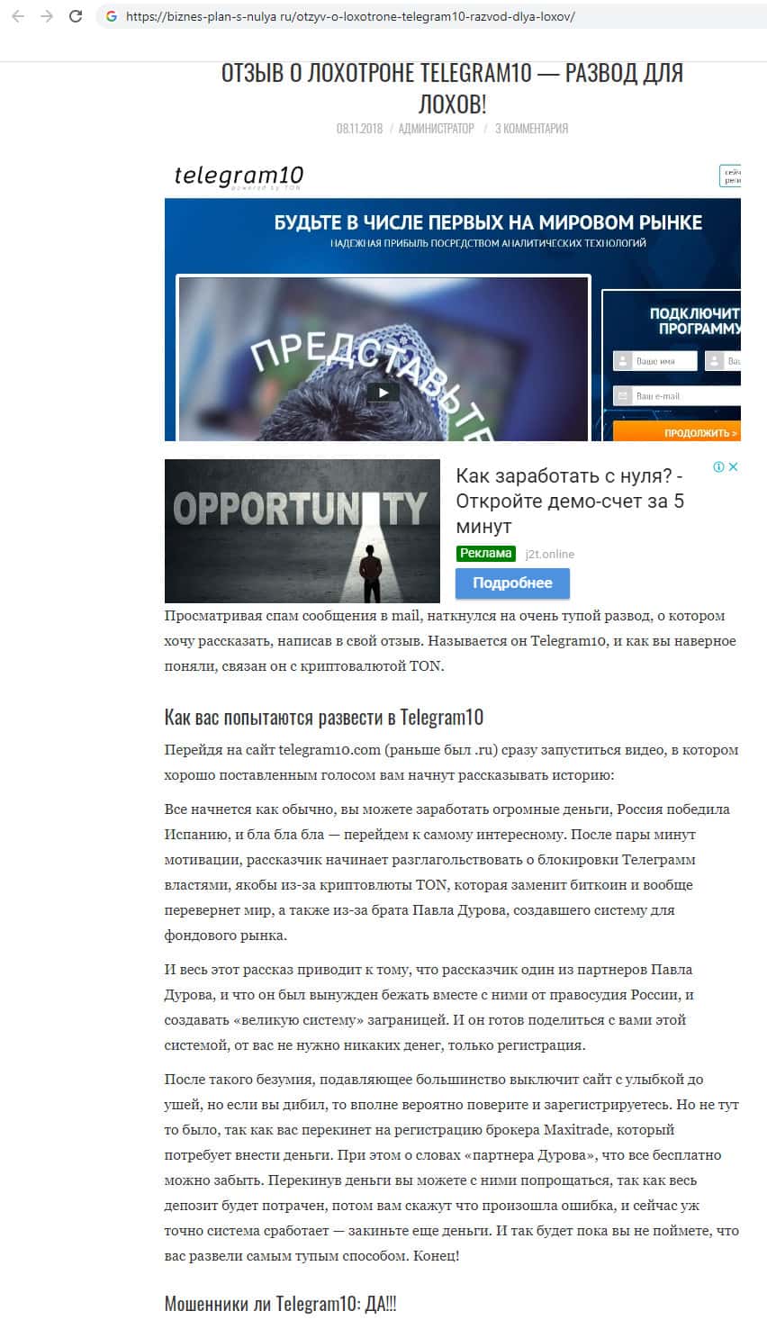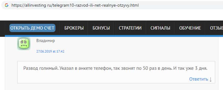 Данный интернет ресурс опубликовал своё мнение по поводу конторы мошенников Telegram10 Ru. В нём он выразился о компании как о лохотроне, который является лишь приманкой для наивных пользователей. Сайт просто зазывает пользователей к псевдоброкерам, обещая клиентам тысячи долларов каждый день.