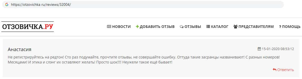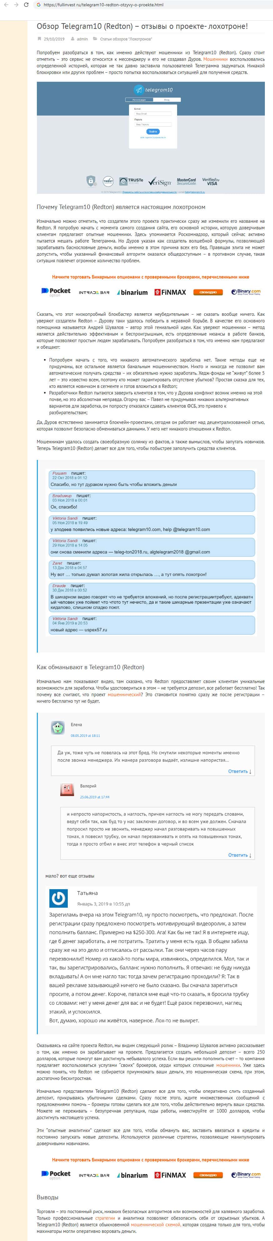 Мы наткнулись на информацию о том, что фирма жуликов Telegram10 Ru это копия компании REDton. Обе конторы принадлежат одним и тем же жуликам, но вот только REDton слилась и забрала все деньги, после чего создали новый лохотрон. Информации о слившихся жуликах нет, так же как и самого сайта.