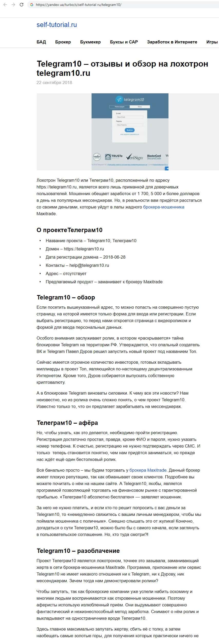 Мнение сайта self-tutorial ru о конторе мошенников Telegram10 Ru