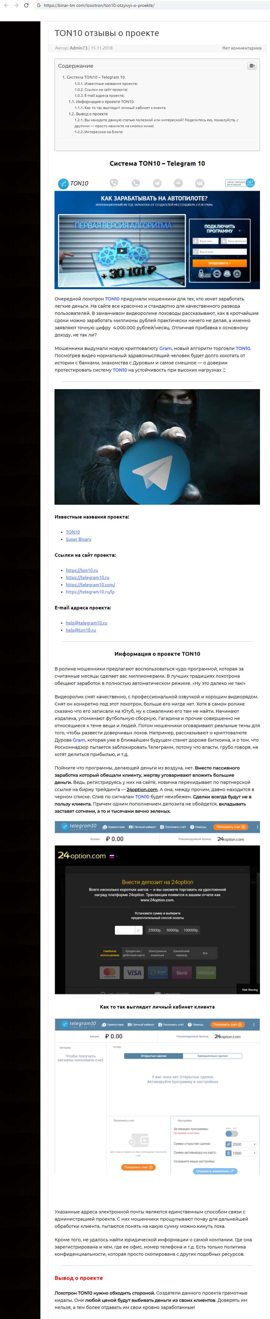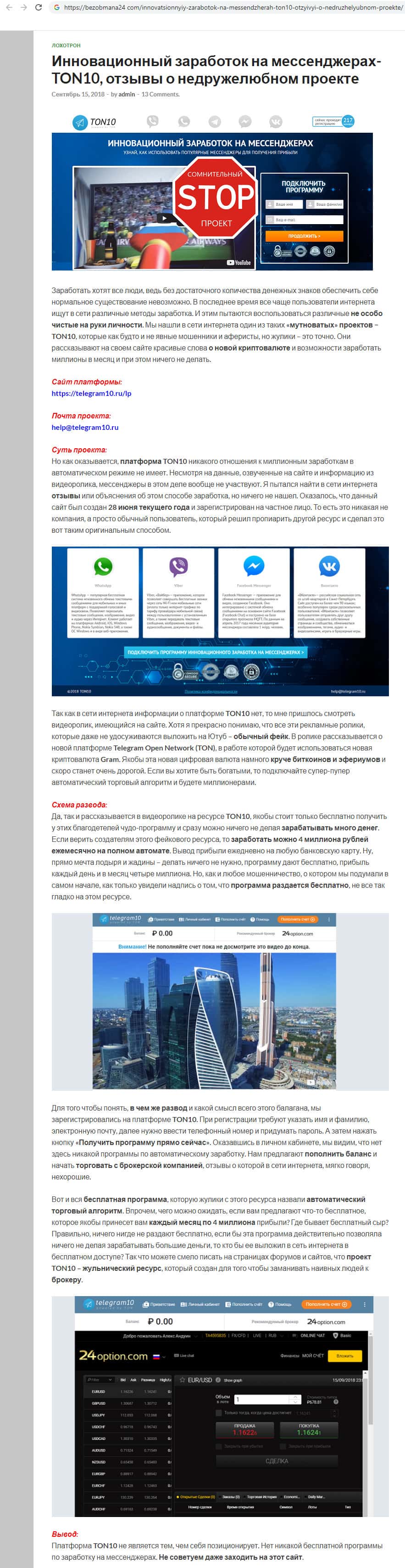 Мы нашли статью о конторе разводил Telegram10 Ru на интернет ресурсе binar-tm com. В статье обозревается вся суть мошеннической фирмы. После обзора сайт представил вывод, в котором советует обходить стороной сайт мошенников и ни в коем случае не вкладывать никакие деньги в данный проект.