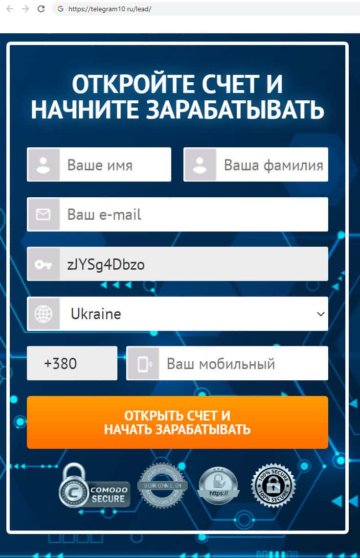 Для того, что бы начать сотрудничать с финансовыми жуликами Telegram10 Ru нужно зарегистрироваться в их лохотроне. Для этого пользователь должен указать своё имя, фамилию, адрес электронной почты и номер телефона. И именно на указанный номер начнутся бесконечные звонки мошенников, которые будут требовать инвестиций.