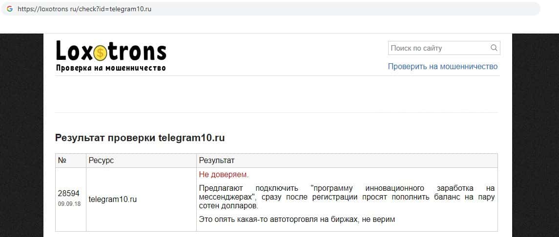 - Проверка компании махинаторов Телеграм 10 через сайт loxotrons ru