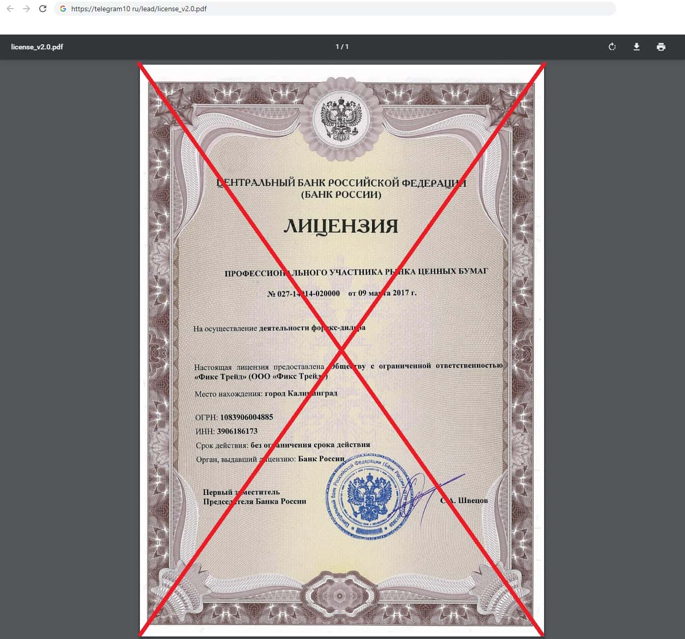 На сайте разводил Telegram10 Ru указан номер лицензии и предоставлен её снимок. Тут компания конечно постаралась, даже не поленилась найти в интернете лицензию посторонней компании, так как лицензия выдана совершенно другой фирме, которая не имеет ничего общего с данными мошенниками. Жулики просто предоставили чужую лицензию.