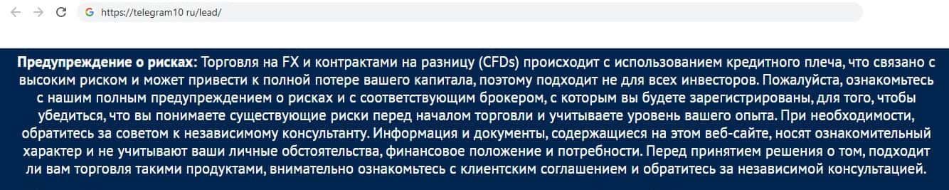 Так же на своём сайте компания представила предупреждение о рисках, в котором говорится о том, что пользователи могут потерять все свои денежные средства, так что вся информация, которую кидалы Telegram10 Ru говорили ранее о том, что это сто процентный заработок без рисков, накрывается медным тазом.