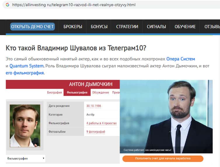 Лохотрон Telegram10 Ru выдаёт себя за проект Павла Дурова, но на самом деле это всего лишь ложь, так как с ним компания не имеет ничего общего. Так же фирма представила Владимира Шулова, это так же вымышленный персонаж, так как его роль исполнил актёр Антон Дымочкин, который решил заработать для себя деньжат.