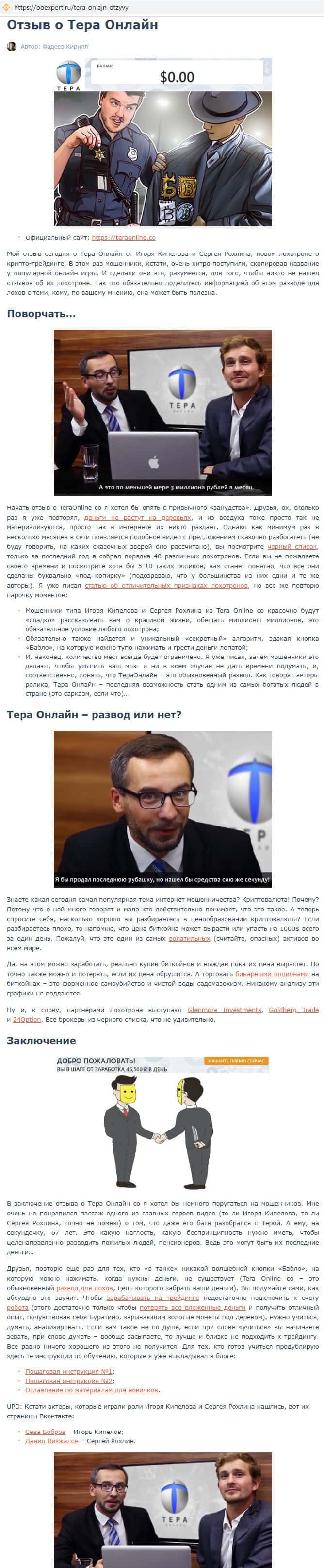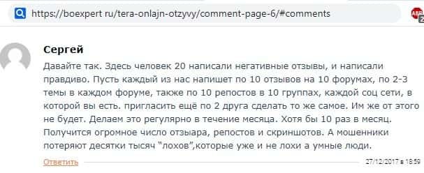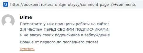 Трейдер в своем отзыве на сайте boexpert ru предлагает всем объединиться и сливать всю негативную информацию о Тера Онлайн Ко в социальных сетях и на форумах.
