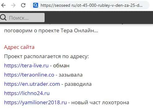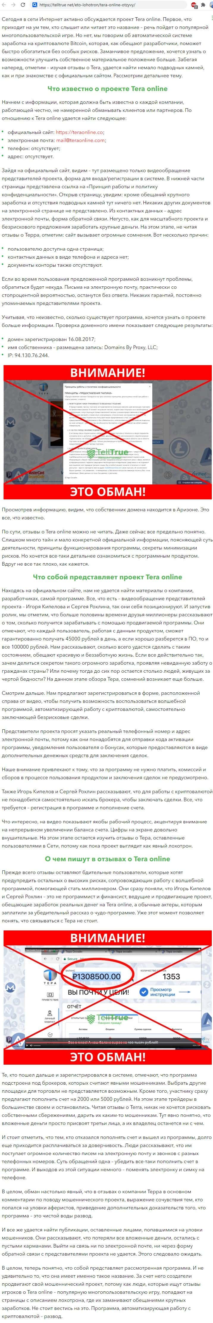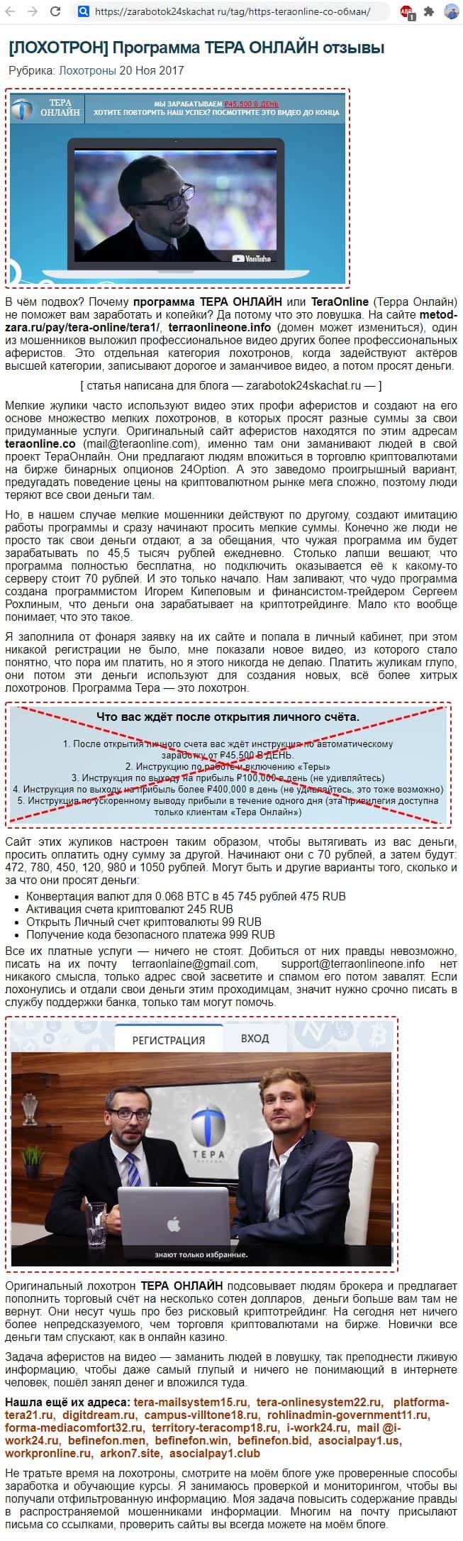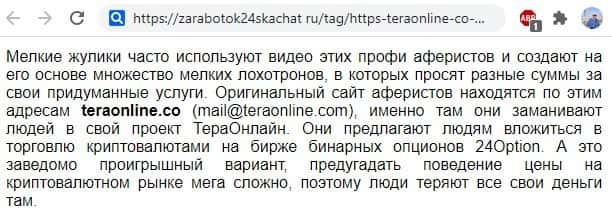 - Обзоры и статьи в Интернете о мошеннической компании Тера Онлайн Ко