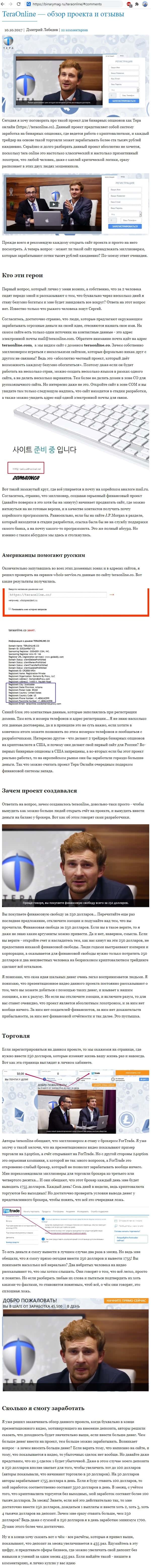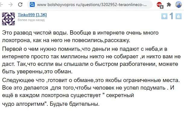 Согласно выводам автора разоблачительного обзора компании TeraOnline Co, опубликованного на ресурсе poisk-strasti ru, эта контора - классический лохотрон.