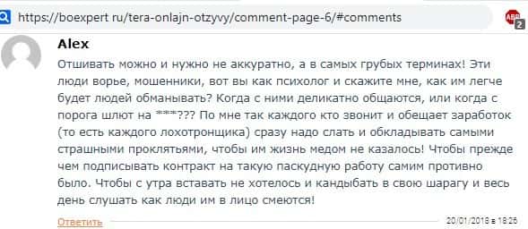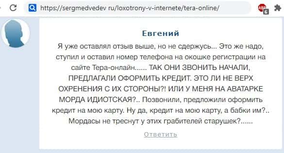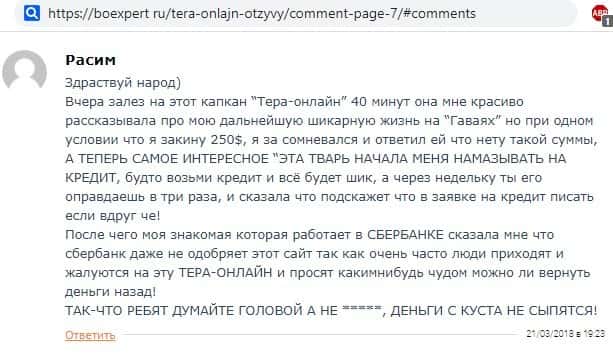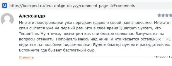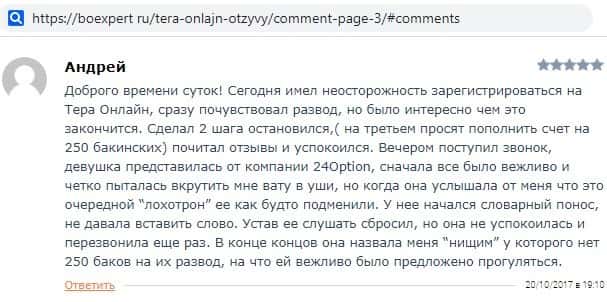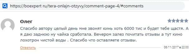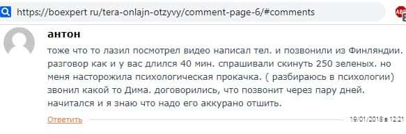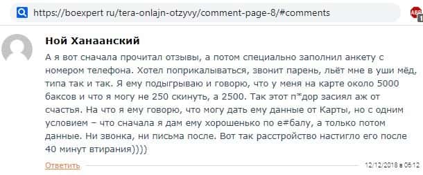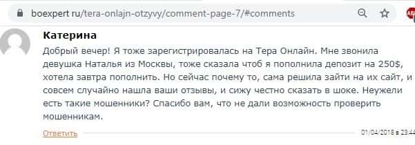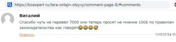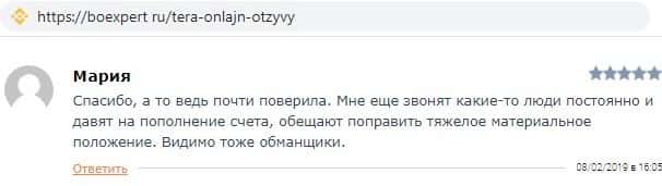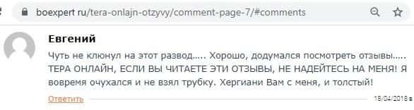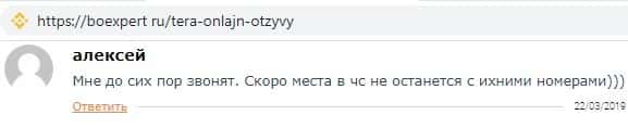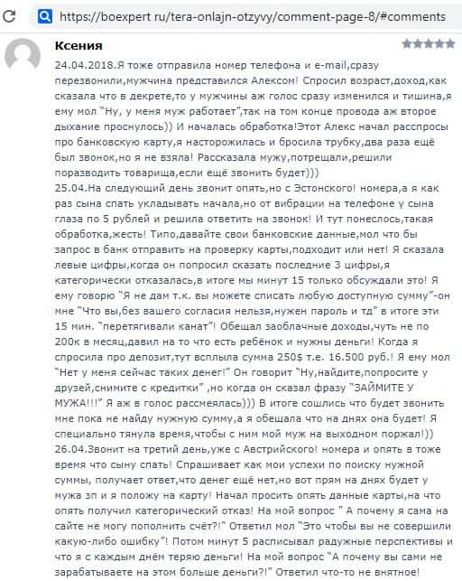 Клиент Тера Онлайн Ко в своем отзыве на boexpert ru сообщает, что сразу после регистрации, мошенники достали его телефонными звонками, требовали денег и к тому же хамили.