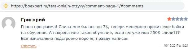 Клиент компании Тера Онлайн Ко в своем отзыве на сайте boexpert ru сообщает, что эти лохотронщики слили его баланс на 250$, но требуют еще денег на какое-то обучение.