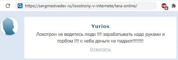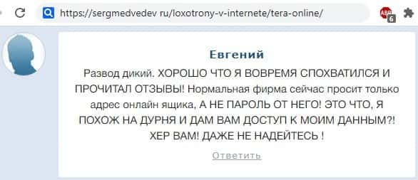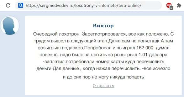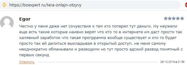 Обманутый клиент мошеннической компании Тера Онлайн Ко в своем отзыве дает ей однозначную характеристику - жесткий лохотрон.